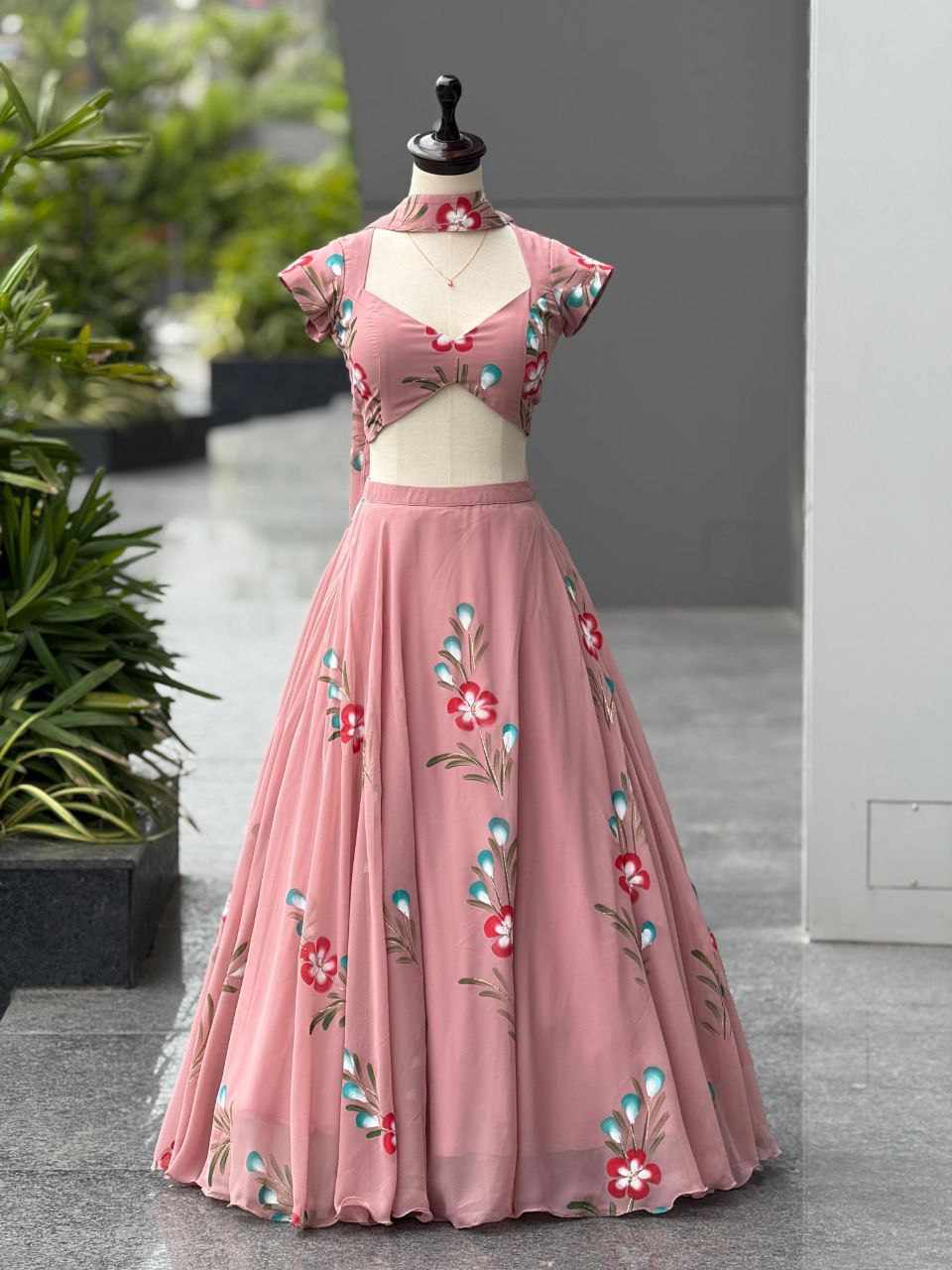 Lehenga – Pure georgette hand-painted lehenga featuring a grand 8-meter flair, finished with canvas patta for beautiful structure