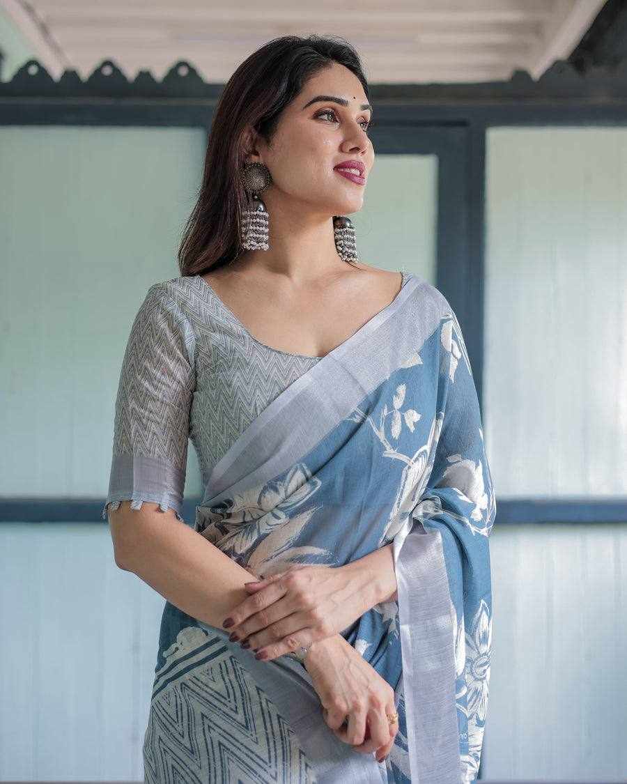 Fabric: Silver Weaving Patta Linen Cotton Saree with beautiful digital print (5.5 meters)