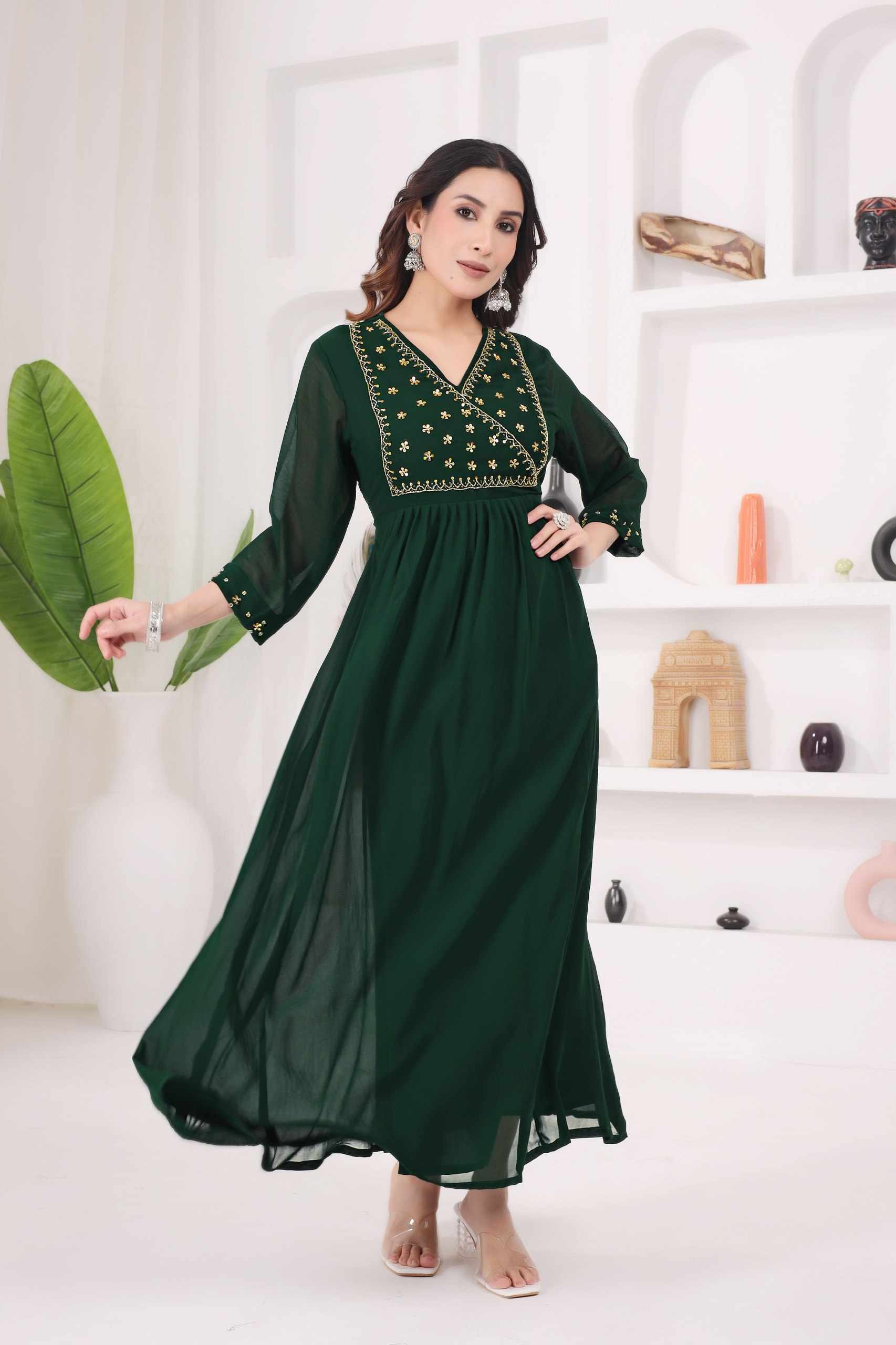 WM12 GREEN BLOOMING GEORGETTE BEAUTIFUL HANDWORK KURTI